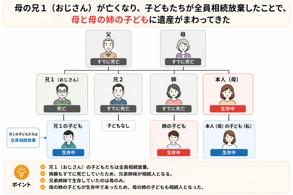 母の相続放棄完了後、母の姉の子ども達(甥・姪)が相続人に